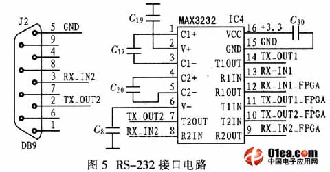 图5为RS一232接口电路。该接口电路采用MAX232。图中,TX_OUTl_FPGA,RX_INl_FPGA,TX_OUT2_FPGA,RX_IN2_FPGA连接至FPGA的I/0引脚,FPGA的输出经MAX232的电平转换后工业自动化网版权所有,通过DB9的插座与PC机串口连接,实现FPGA与PC机通信,便于后续Nios II嵌入式软核调试。为了实现高速图像的采集与存储,保证在高速图像采集中图像的完整性,必须含有缓冲区。利用两片SRAM,其成本较低、容量大、操作简单,能够完成图像数据缓冲功能。SRAM选用IDT71V416,容量为256 Kxl6 bit,访问速度为10 ns,使用两片SRAM即可构成256 Kxl6 bitx2=8 Mbit的高速缓存,从而可实现图像数据的不间断传输。