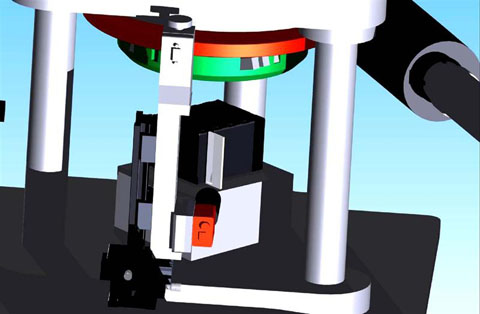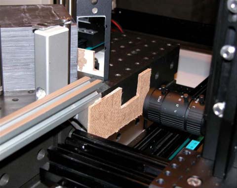 前置摄像头在一条垂直轴上移动,其位置由检测较后一层感光层的上沿动态控制,这对于补偿铅/感光层的高度变化非常重要,因为这关系到每层的厚度公差、层与层之间的空气残留、以及单元块的重量(整块单元块的重量约10 kg)。