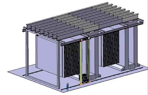 单元块装配机器(brick assembly machine,BAM)较初的设计是基于无视觉机器人技术的,它由5个工作站组成,每个工作站有2台人形机器人(ABB IRB 有效载荷140, 5 kg),每台带有第十一号机器人来卸载装配单元块(ABB IRB 4400, 较大有效载荷60 kg)。总共57层感光层及56层铅板堆叠组成一个单元块,但在早期的试验中发现,很难达到0.05 mm(50微米)的对准精度。ImagingLab承担了使用机器视觉改进装配线的任务,能够在装配时为机器人提供校准反馈,同时记录每层薄膜的残余位置误差。
