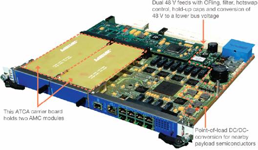因此每个载板运行需要高性能的电源转换和控制功能,主要针对输入电源部分以及存在于载板或AMC模块中的有效载荷电源部分。这个高性能的载板功能如图3所示。载板是水平架构280毫米深以及322毫米高。在例子中,包含了从-48V的直流/直流转换到中间母线电压,然后作为两个AMC模块的输入。这个母线电压也可以作为载板上负载点调整器的输入电压。
