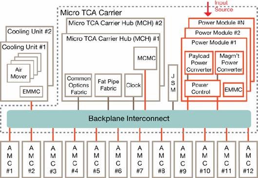 图4. MicroTCA架构概览(红色为电源系统部分)。
