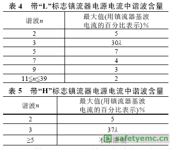 标准4.9.1 电源电流波形镇流器与灯(一只或几只)在额定电源电压下工作,灯达到稳定工作状态之后,低畸变型镇流器(带L 标志)的电源电流中谐波含量不得超过表4 中规定极限值。带“H”标志的镇流器的电源电流中谐波含量不得超过表5 规定极限值。