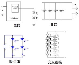 另外,应用中通常会使用多颗LED,这就涉及到多颗LED的排列方式问题。各种排列方式中,首选驱动串联的单串LED,因为这种方式不论正向电压如何变化、输出电压(Vout)如何“漂移”,均提供极佳的电流匹配性能。当然,用户也可以采用并联、串联-并联组合及交叉连接等其它排列方式,用于需要“相互匹配的”LED正向电压的应用,并获得其它优势。如在交叉连接中,如果其中某个LED因故障开路,电路中仅有1个LED的驱动电流会加倍,从而尽量减少对整个电路的影响。