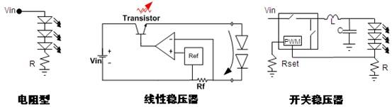 采用DC-DC电源的LED照明应用中,可以采用的LED驱动方式有电阻型、线性稳压器及开关稳压器等,基本的应用示意图参见图4。电阻型驱动方式中,调整与LED串联的电流检测电阻即可控制LED的正向电流,这种驱动方式易于设计、成本低,且没有电磁兼容(EMC)问题,劣势是依赖于电压、需要筛选(binning) LED,且能效较低。线性稳压器同样易于设计且没有EMC问题,还支持电流稳流及过流保护(fold back),且提供外部电流设定点,不足在于功率耗散问题,及输入电压要始终高于正向电压,且能效不高。开关稳压器通过PWM控制模块不断控制开关(FET)的开和关,进而控制电流的流动。