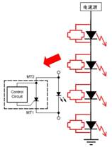如前所述,LED是一种使用寿命极长的光源(可长达5万小时)。除了需要针对具体的LED应用选择适合的LED驱动解决方案,还需要为LED提供适当的保护,因为偶尔LED也会失效。其原因多种多样,可能是因为LED早期失效,也可能是因为局部的组装缺陷或是因瞬态现象导致失效。必须对这些可能的失效提供预防措施,特别是因为某些应用属于关键应用(故障停机成本高),或是安全攸关的应用(如头灯、灯塔、桥梁、飞行器、飞机跑道等),或是在地理上难于接近的应用(维护困难)等。在这方面,可以采用安森美半导体的NUD4700 LED分流保护解决方案。图5是这种分流保护解决方案的应用及原理示意图。