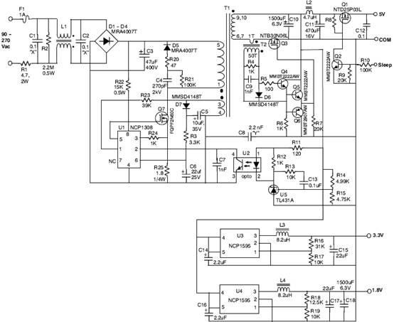 本文介绍的参考设计采用通用交流输入,提供5.0 V、3.3 V和1.8 V输出,能效高于72%。只要简单改变3.3 V和1.8 V输出上的检测网络,也可以提供其它输出电压。如果需要“休眠模式”的话,该设计也提供抑制5 V输出的选项。此电源的主转换器使用安森美半导体的NCP1308电流模式控制器及1个外部MOSFET,采用准谐振(QR)反激拓扑结构设计。5 V输出采用1个同步整流MOSFET,而2个较低电压输出转换器采用工作在1 MHz频率的NCP1595单片同步降压稳压器来实现。5 V输出还充当2个降压稳压器的直流源。这种特别的元件组合提供了一种简单但有效的三输出开关稳压器,根据输出电压和电流组合及相应系统总能效的不同,提供近6 W的有效功率输出。此设计除了具有输入传导EMI滤波器,还增加了过流保护(OCP)和过压保护(OVP)等典型保护功能。
