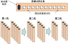 首先,在模块化途径替代金卤灯光源方面,可使每个LED光条采用固定数量的LED。随着LED在光输出等方面性能的持续提升,要提供相同的总光能输出,就可以使用更少的LED光条,从而降低需要使用的LED的成本,参见图3。