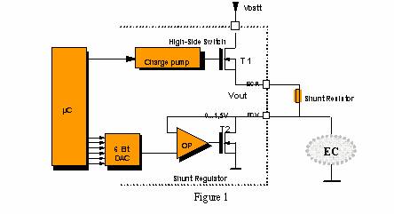 在新一代汽车外部后视镜中,内置功能的数量大幅增加:侧面回复反射器或转向灯/闪光灯、车门外部灯、除霜器、后视镜折叠和调节等等。除这些功能外,较近又增加了电动防眩目后视镜控制功能:在夜里后车大灯眩光刺眼时非常需要这种防眩目的后视镜。电动防眩目后视镜能够自动变暗,避免反射光照射驾驶员的双眼。电动防眩目 (EC)镜是一种阻容等效负载:控制EC镜需要一个复杂的控制策略。EC镜在透明与颜色较深之间的电压是0V到1.2V;在颜色开始变深时,较大电流在150-250 mA之间。如果使用一个传统的线性控制器,从12V电瓶电压降到1.2V防眩目镜电压,将会损耗太多的电能(大约12-1.2V*0.15A=1.62W);考虑到电磁控制(EMC) 问题,不推荐使用开关式控制器。因此,较初嵌入在汽车电子元器件内的EC控制电路是基于一个与EC镜并联的并联控制器(如图1所示)。