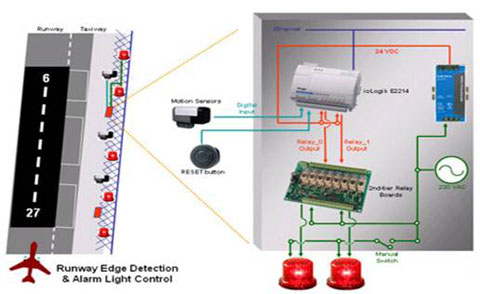 这套安防系统使用了大量的数字摄像机以及PTZ,且这些摄像机往往需要与I/O告警信号进行联动,例如一个人企图入侵机场跑道,除现场告警灯、喇叭警告外,中央控制室的人员亦需要知道该入侵事件的现场画面并对画面做出实时记录。在一般的Ethernet I/O应用中,中央控制电脑在读到I/O告警事件后会对数字摄像机或者PTZ做出摄像或者转向命令,在一连串的动作中,这些信号的往返及轮询都将消耗频宽及系统资源且实时性非常差。而现在使用MOXA智能以太网I/O,将不只是主动的将告警信息通过Ethernet上传,同时也可以不通过中央监控主机进行对前端数字摄像机或者PTZ发布CGI(Common Gateway Interface)命令,直接进行转向或者摄像。