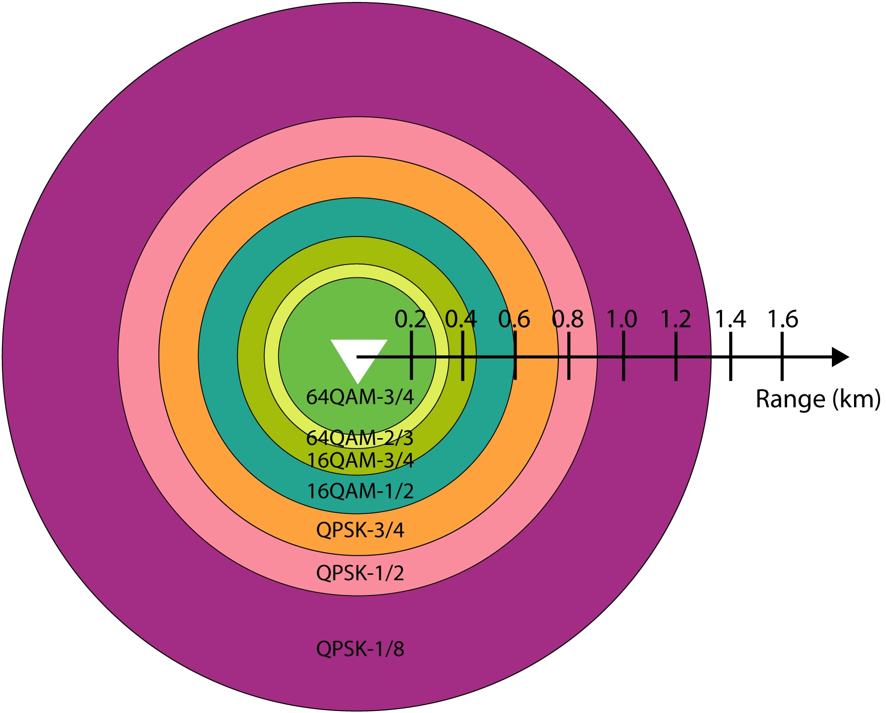 我们需注意,紫色环标注的QPSK-1/8表示迭代4次的QPSK-1/2调制。这是较稳健的调制方案,而且在较大距离处的确是必要的。根据我们的计算得出,在发射功率为+23dBm时,对于距离基站0.9km到1.35km的移动设备,移动台必须采用QPSK-1/8调制。在较近的距离处,移动台可采用较高的调制级,网络容量因此增大。例如,在距离基站0.45km到0.6km的地方,移动台可采用16QAM-1/2调制。由于16QAM-1/2调制会每一符号发射2个比特位,而QPSK-1/8每一符号只发射0.5个比特位,故靛蓝色环中的吞吐量比紫环中的多4倍。
