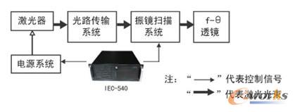 激光标刻系统主要由HOLL工控机、激光器、振镜扫描系统、f-θ透镜几部分组成,电源系统接220V(50Hz)分别给工控机和(气体/固体)激光器供电,工控机激光标刻软件控制振镜扫描系统和激光电源。准备进行标刻作业时,由工控机向电源系统发送信号来控制激光器开关光以及其激光功率大小,同时标刻坐标数据作一定变换后传递给振镜扫描系统,振镜扫描系统接收信号对X /Y 轴振镜进行调整,即将X /Y 轴振镜镜片偏转一定角度。此时完整光路传输路径为激光器发出光束X 和Y 振镜折射后,入射至待标刻工件表面。