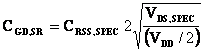 式中的CGS=CISS-CRSS是MOSFET的线性栅极至源极电容,CGD,SR是非线性栅极至漏极或“密勒(Miller)”电容CGD =CRSS的低电压值。这个电容的一种有用的方法是在SR关断期间正好在电压摆幅的中间,即VDD/2。这个值可以从相对于电压的CRSS曲线读取,或者可以利用数据手册中给出的CRSS,SPEC值计算出来,对于一些较高电压CDS,SPEC可通过以下经验公式计算: