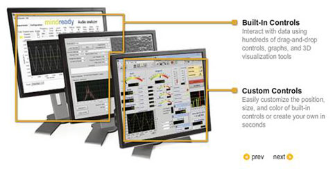 LabVIEW图形化开发工具为快速建立用户界面提供了多种选项。首先,每个LabVIEW程序(即VI)包含了应用程序的图形化代码和程序的用户界面。因此,与其他编程语言不同,用户不需要编写大量附加的程序构建用户界面,使用LabVIEW,用户可以免费得到用户界面。在LabVIEW中,提供了数百个内建用户界面项目,从图表到拨盘直至三维图片控件,帮助用户为原型系统快速构建HMI。