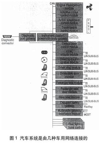 CAN 具有低、高速两种实施方案,使用不同电压在一对导线上进行通信,通常称为高速物理层和低速物理层。当两根导线中一根因短路或一路发生故障时,低速体系结构变为单线工作体系结构(所谓离线地)。由于电路需要具备这一功能的缘故,这种体系结构在超过125Kbps总线速率时,其实施成本是十分昂贵的。因此,125Kbps是高速与低速CAN的分界线。图1表示CAN支持其它车用网络的连接方法。