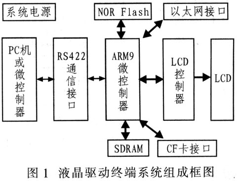 系统主要有ARM9微控制器、存储单元、LCD控制器、CF卡接口与RS422通信接口组成,系统组成框图如图l所示。工作流程:系统上电后,ARM9微控制器从NOR Flash中读取、解压Linux内核与Ramdisk根文件系统到SDRAM中,律压完成后,启动Linux内核并挂载根文件系统;当软件环境初始化完成后启动应用程序,开始接收串口命令,应用程序接收到有效的串口命令后,图形界面数据通过Fmmebuffer接口传送给LCD控制器。