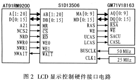 系统选用EPSON公司的显示控制器件S1D13506用于控制LCD的图像数据显示。S1D13506可与多种CPU总线兼容,支持较高为16位数据宽度的LCD接口.可以在TFTLCD、CRT较高显示64 K颜色。它配置一个16位内存接口,支持较高2 MB的EDO-DRAM。系统中将S1D13506连接在AT91RM9200的BANK 3,数据总线宽度为16位.地址线A21与S1D13506M/R引脚相连,用于选择访问寄存器与显存。AT91RM9200访问S1D13506显存起始地址为0x30200000.寄存器起始地址为0x30000000。使用了GM71V18163型2MBDRAM作为显示存储,AT91RM9200通过访问S1D13506数据地址空间,实现对DRAM的数据存储操作,使用50 MHz的有源晶振作为DRAM的总线时钟,25 MHz有源晶振作为LCD的像素时钟信号,支持640x480 60 HzTFT LCD显示,LCD行、场同步信号由S1D13506内部通过对25 MHz像素时钟分频得出。LCD显示控制硬件接口电路如图2所示。