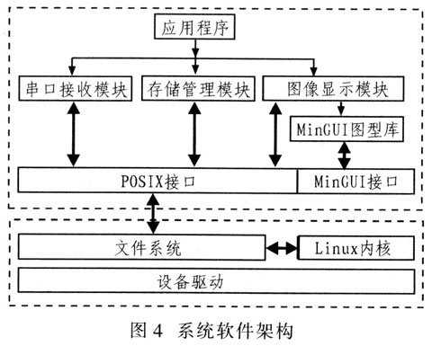 系统软件可以使用Linux、VxWorks等操作系统,也可使用从直接操作低层硬件的前、后台软件。使用前、后台方式的软件虽然能够实现对硬件的充分利用,但使用操作系统增强了系统的可维护性与扩展性。系统在运行和使用过程中需要管理CF卡中的数据以及应用程序需要多线程支持,众多操作系统中,开源的Linux操作系统具有较为完善的文件系统与网络协议族,并且能较好的支持多线程程序,可满足设计需求。该系统使用的Linux内核版本为2.4.2l,交叉编译工具链为ARM-Linux-cross-2.95.3。系统软件架构如图4所示。系统中,无论应用程序调用POSIX接口直接控制LCD显示还是通过MiniGUI间接控制LCD,较终都要调用相应的液晶控制器驱动接口函数,因此如何设计出一个S1D13506特殊硬件的驱动程序是整个软件设计的重点。