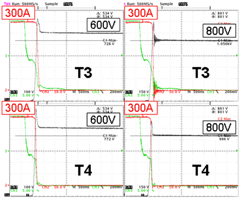 图4. 在Tj=25°和L等于65nH条件下,中功率300A IGBT的关断操作。