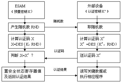 数据的安全性取决于密钥的安全性。ESAM主要是采用随机数理论,用DES算法计算认证码,通过比较认证码的方法进行芯片内部密钥与外部认证密钥的对比,从而达到判断与认证的目的。