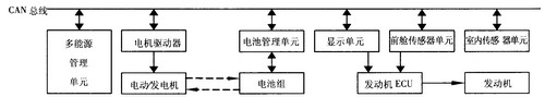 由微处理器、程序和数据存储器、D/A转换、开关量接口及电机调速控制几部分构成。它的功能是通过总线接收多能源的对电机的控制命令并及时执行,它主要控制电机的发电与电动状态的切换、电机的转速及输出力矩的控制,通过总线向多能源管理单元报告电机的状态如转速、充电电流、放电电流及故障等状态,当电机出现故障时能进行自处理以保证车辆的安全运行。