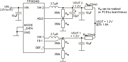 关于图所示1的两个输出级并联,设计人员可能存在疑虑,因为有超过内置MOSFET开关的电流能力风险,但是这并不是担心的理由,因为TPS62410有MOSFET开关内部过流保护。这些开关中的电流得到了周期性监控,一旦达到了1.2A,开关就会断开,而当电流降至该值时,会再一次导通。