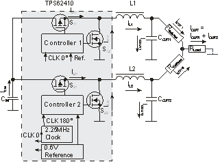 图2解释了双相配置的功能,显示了采用两个DC-DC转换器的TPS62410的简化框图,及其功率级、时钟和内部基准。由于两个转换器的高压侧开关为180°相移操作,可以实现双相操作。