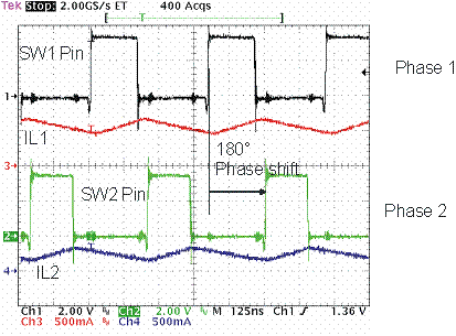 图3显示了开关节点SW1、SW2和相应的电感电流的示波器曲线图。高压侧开关之间的180°相移涉及4.5MHz的有效开关频率,它是原始时钟频率的两倍。