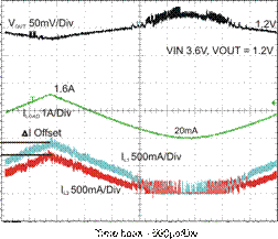 图5的示波器曲线图通过测量电感电流IL1和IL2显示了两个转换器之间电流平衡。随着很小的偏移,输出电流从20mA到1.6A的上升和下降,电感电流IL1和IL2增大和减小。