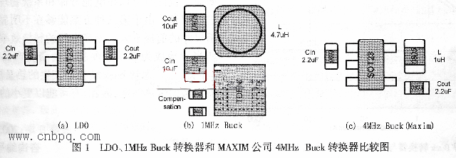 较新推出的定制电源管理芯片(PMIC)已经集成了一路或多路buck转换器,但这些产品还常常不足以满足用户的要求。每增加一项新的功能,就有可能需要另外一路buck电源或需要提高buck电源的驱动能力,只有那些能够迅速采用分立电源IC来满足新设计需求的制造商才能保持其产品性能与市场需求同步增长。就目前的设计水平而言,要想在系统中增添一个buck转换器不仅需要增加成本,而且要占用一定的线路板面积。三年前的buck转换器封装尺寸为15mm2,可工作在1MHz或更低的开关频率,需要较大尺寸的外部电感和钽电容。而近期推出的TDFN封装1MHz buck转换器的尺寸已降至9mm2,且外部可以使用陶瓷电容和小尺寸电感,但它的尺寸还是远远大于LDO。先进的亚微米BiCMOS混合信号处理工艺是解决尺寸问题的关键技术,它能够进一步缩小电源IC的尺寸,提高其工作频率,从而使其能够选用更小尺寸的外部元件。许多IC制造商已经能够提供2MHz甚至更高频率的电源IC,同时也采用了更小的封装。图1所示是LDO、1MHz Buck转换器和MAXIM公司4MHz Buck转换器的比较示意图。可以看出:Maxim所提供的4MHz buck转换器(MAX8560)的尺寸几乎与LDO一样小!但可采用更高的工作频率,同时允许使用微型电感(如:Taiyo Yuden的CB2012系列,0805封装)。从目前1MHz 和4MHz buck转换器的制造工艺进展情况看,4MHz buck转换器的效率要比1MHz buck转换器的效率低,因为较高的开关频率将产生较大的开关损耗,而微型电感也存在较大的磁芯损耗。图2所示是Buck转换器效率与负载电流的关系曲线。值得庆幸的是,1MHz和4MHz的Buck转换器效率差别并不大,而且,它们的效率远远高于LDO(41%)。
