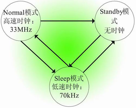 电子纸显示的显著特点之一是其省电模式,当其显示一幅画面后,由于电子纸的特殊技术因素,此幅画面在无供电或不刷新的情况下可长时间保持。APOLLO芯片驱动部分也同样具有两种省电模式:Sleep和Standby,能够很好的实现低功耗的工作方式。Sleep模式使用低时钟(70kHz),能够接收主CPU的指令;Standby模式不使用时钟,利用主CPU的唤醒信号使APOLLO恢复有效。这两种模式与Normal模式的转换如图5所示。