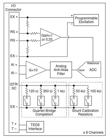 NI PXIe-4330 24位同步桥路输入模块针对高性能应力、载荷、力和扭矩测量应用提供.02%的标准精度和每通道25 kS/s的采样率。桥路输入模块采用比率计的设计,即模数转换(ADC)参考激励电压,从而能达到更高精度。该方法使测量无需依赖于激励电压的稳定性和精度。此外,通过使用独特的delta-sigma ADC能同时提供卓越的AC性能和DC精度,而传统的delta-sigma ADC仅仅能提供不错的AC规范参数。