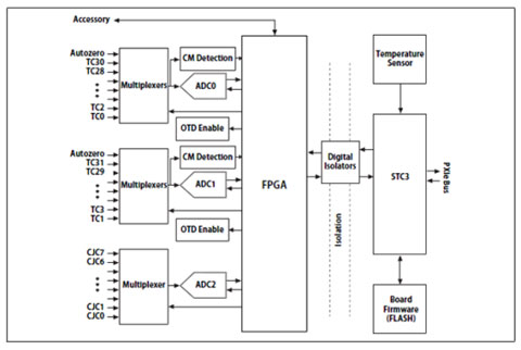图5. NI PXIe-4353通过3个ADC多路复用32条热电偶通道,8条CJC通道及两条自动清零通道。