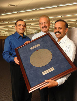 Maxim总裁兼CEO Tunç Doluca、集团总裁Vijay Ullal和运营高级副总裁Vivek Jain共同展示首个300mm晶圆(Anne Knudsen摄)