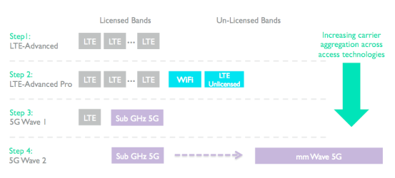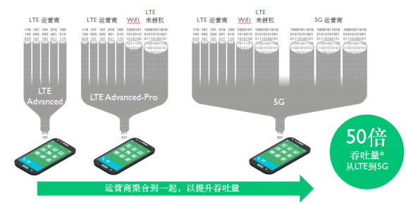 · 载波聚合的大量增加。吞吐量和网络容量较终由日益复杂的载波聚合提供。该聚合让手机调制解调器处理器具有高运算复杂度,因为其为多个并联无线接入承载服务。该主题将持续成为LTE技术(LTE高级Pro)和5G技术进化的关键。