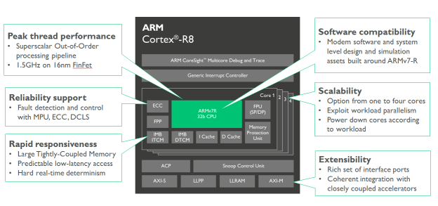 强实时(hard real-time)是指处理器在已知较坏(决定性的)情况延迟下,可以非常快速地切换以解决一件新的重要事件。该较坏情况延迟通常都只有几纳秒,使来自系统其他部分的中断能够得到发现并迅速采取行动解决。第一层LTE高级Pro和5G调制解调器的任务控制将处理多载波和很高的数据速率。因此,处理器必须以很高的时钟脉冲频率运行,并能够在很多任务之间很快速地切换并处理外来事件。诸如Wi-Fi的未授权载波提供的数据和数据包速率比LTE更高,将这些不同的载波结合和控制需要一个专门的处理器。带有11级流水线的Cortex-R8可以被快速计时,以提供所需的性能。流水线是“乱序的”,这意味着就算有些指令在等待来自较慢外部存储系统的数据时,也可以继续处理,这在很大程度上减少了流水线的“故障”,并提供尽可能较好的性能。