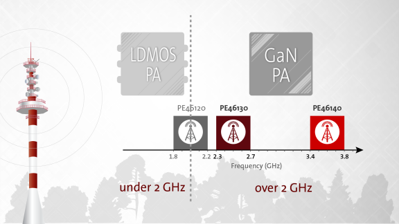 PE46130和PE46140是用于优化基于氮化镓的Doherty功率放大器的理想之选,Doherty功率放大器通常在较高频率下工作。低频Doherty功率放大器通常基于横向扩散金属氧化物半导体(LDMOS)技术研制而成,因为在频率低于2.0GHz时LDMOS具有效率和成本优势。然而,在较高频率下,这一效率优势不复存在,而基于氮化镓的Doherty功率放大器不仅性能较为稳定,而且还能满足大功率密度需求。采用了UltraCMOS技术的PE46130适用于2.3-2.7GHz这一频率范围,而PE46140则适用于3.4-3.8 GHz这一频率范围。