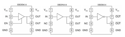 RDD614 被配置为带使能的非反相驱动器。HRDN614被配置为非反相驱动器,而HRDI614 被配置为反相驱动器。HRD_614系列用在8 引脚塑封表贴SOP 封装中。